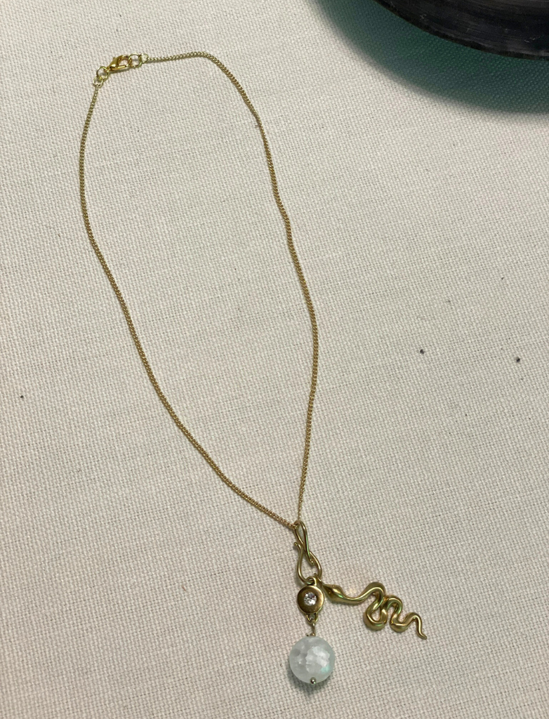 The Selenite Snake Charm Necklace is a stunning piece featuring a 16" gold-plated chain with a 3.5" extension. It showcases a raw brass snake charm, a mystical selenite crystal charm, and an antique gold Swarovski crystal clear charm. This necklace combines elements of nature and elegance, making it a perfect statement piece for any outfit. It's a favorite next to the Signature Snake Charm Necklace.