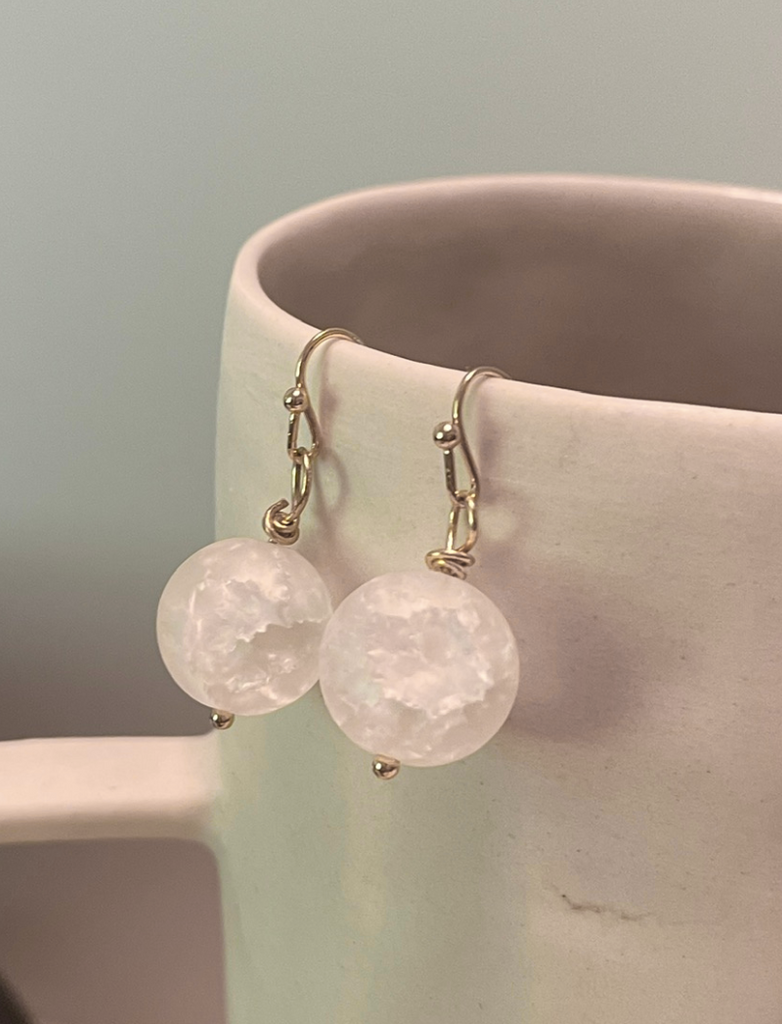 data-description="<p><meta charset="utf-8">These White Crackled Quartz Earrings capture the light beautifully, with their unique crackled texture and subtle elegance. Set on gold-plated hooks, they’re a versatile accessory that complements any outfit with a touch of understated glamour.</p>